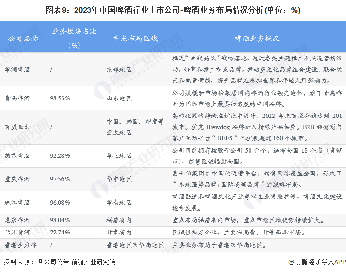 啤酒行业的上市公司中,百威亚太、华润啤酒以及青岛啤酒的营收规模位于中国啤酒市场的第一梯队,销售区域覆盖中国全域。从已有数据来看,青岛啤酒的啤酒业务占比最高,达98.53%。