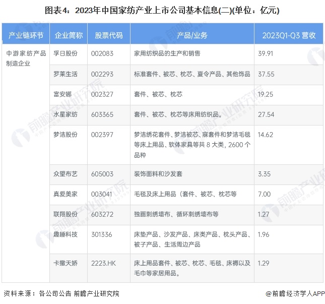 行业主要上市公司:孚日股份(002083);罗莱生活(002293);富安娜(002327);水星家纺(603365)等。