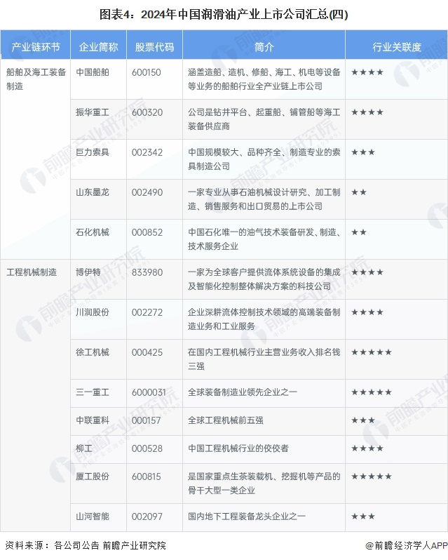 目前,我国润滑油相关产业链中上游产业包括原油/石油供应、润滑油基础油和润滑油添加剂,中游润滑油制造主要包括汽车润滑油和工业润滑油等,下游产业包括汽车制造、动力系统制造、农业机械、船舶及海工装备制造、工程机械等,润滑油作为工业应用、汽车制造中的血液,为工业、运行提供润滑作用。其中产业链各个环节具体上市公司包括: