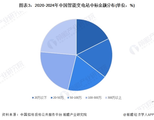 在2020-2024年中标的智能变电站项目中,公布投标金额的共有708起,其中300万以上的项目最多,份额达24%,行业项目整体中标金额较大。