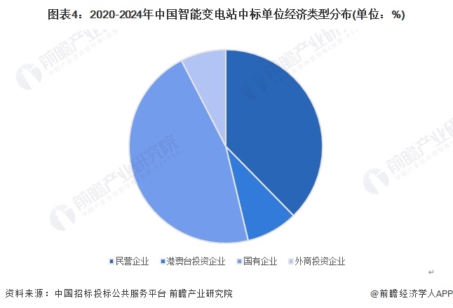 从中标单位经济类型来看,中国智能变电站中标单位以国有企业为主,占比达46%,其次为民营企业,占比约38%。