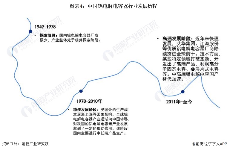 随着国外的生产成本逐渐上涨等因素的影响,世界铝电解电容器制造商已经全面和迅速向中国大陆转移,对我国的铝电解电容器产业发展起到了一定的推动作用。我国近几年铝电解电容器产业发展迅速,在某些特定领域打破了垄断,开发出了高端产品,例如高分子固态电容、叠层片式电容等。但是,国内铝电解电容器行业的整体水平仍以中低档产品为主。截至目前,我国铝电解电容器产业的发展大致可分为三个阶段,目前正处在高速发展阶段。
