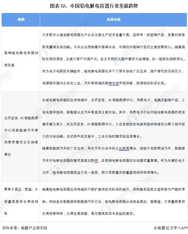未来,中国铝电解电容器行业将呈现高端铝电解电容器加速发展、光伏逆变,AI智能数据中心和新能源汽车等消费类需求正在持续增长以及聚焦于高压、宽温、大容量密度和长寿命特性等发展趋势。