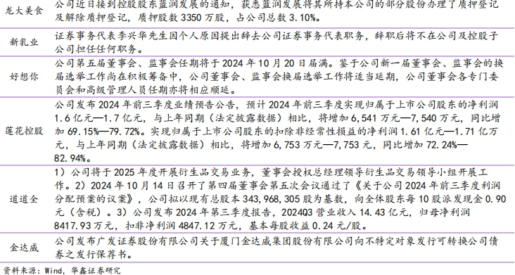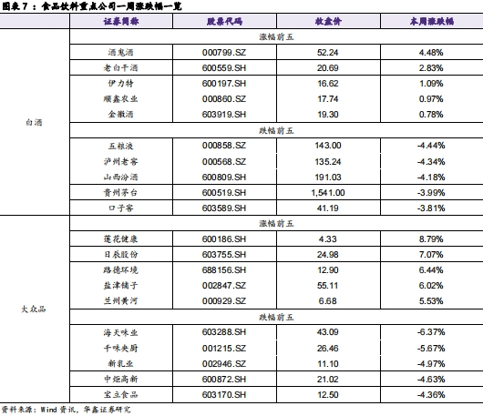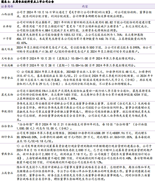 白酒板块:本周板块继续下跌,自高点后持续回调,本周五三季度经济数据披露,整体表现略超预期带动市场情绪回升,同时央行政策逐步落实,增强市场流动性,再次稳固市场信心,目前政策利好导向明显,情绪与资金面恢复与加强,预计持续提升板块估值中枢,股价预计先于基本面回升。基本面来看,目前进入白酒销售淡季,茅台原装散装价差继续缩小,主要系整箱团购、送礼需求减弱所致,各酒企业绩表现预计持续分化,短期建议关注三季报的业绩出清情况,长期仍依靠商务场景恢复与整体信心提升,我们重点推荐茅五泸+山西汾酒+今世缘+古井贡酒,关注洋河股份+迎驾贡酒+老白干+珍酒李渡。