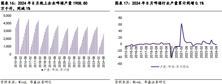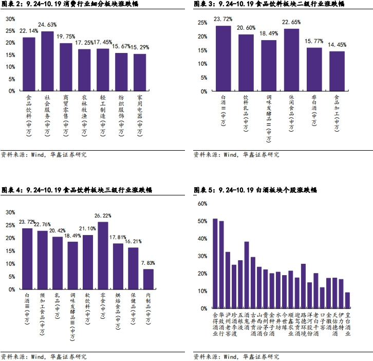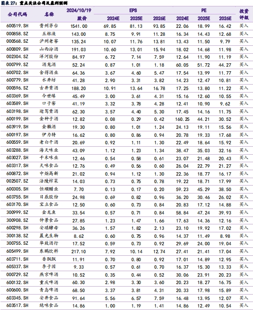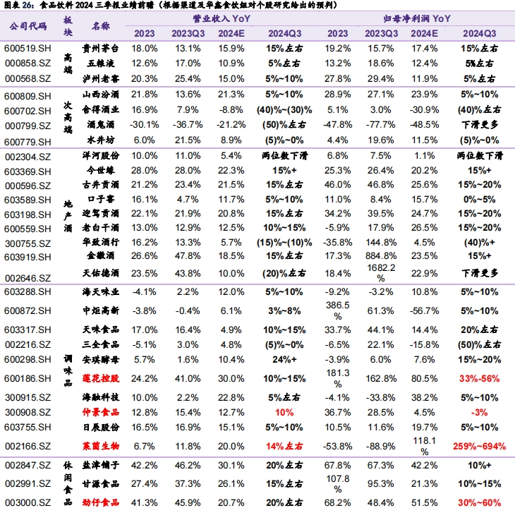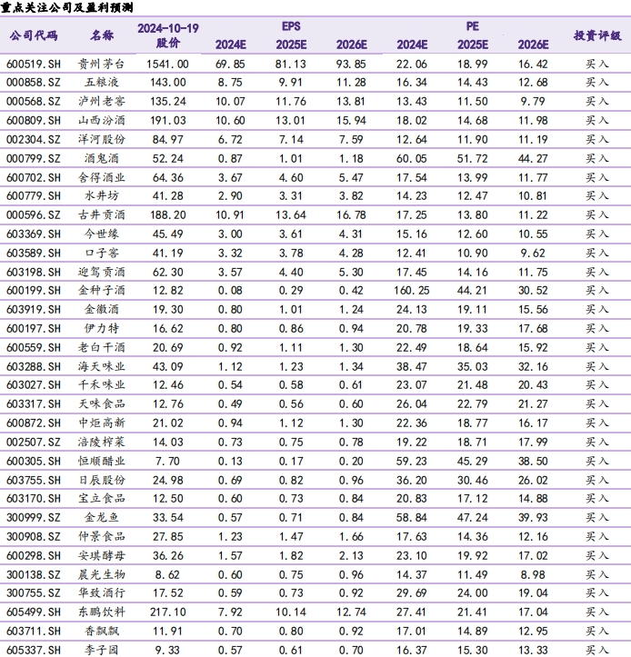 白酒板块:本周板块继续下跌,自高点后持续回调,本周五三季度经济数据披露,整体表现略超预期带动市场情绪回升,同时央行政策逐步落实,增强市场流动性,再次稳固市场信心,目前政策利好导向明显,情绪与资金面恢复与加强,预计持续提升板块估值中枢,股价预计先于基本面回升。基本面来看,目前进入白酒销售淡季,茅台原装散装价差继续缩小,主要系整箱团购、送礼需求减弱,各酒企业绩表现预计持续分化,短期建议关注三季报的业绩出清情况,长期仍依靠商务场景恢复与整体信心提升,我们重点推荐茅五泸+山西汾酒+今世缘+古井贡酒,关注洋河股份+迎驾贡酒+老白干+珍酒李渡。