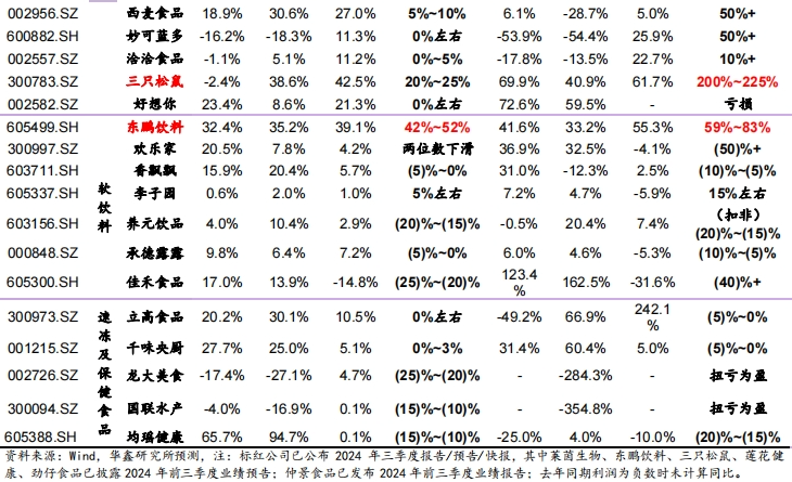 劲仔食品:公司发布三季度业绩预告,预计2024Q1-Q3归母净利润2.08-2.23亿元,同增56.47%-67.75%,扣非归母净利润1.83-1.98亿元,同增67.14%-80.86%,净利润增长的主要原因一方面是营业收入增长带来的规模效应和供应链效益优化,另一方面是主要原材料、辅料、包材等价格同比均有所下降;2024Q3归母净利润0.65-0.80亿元,同增30%-60%,扣非归母净利润0.60-0.76亿元,同增61.06%-101.05%。公司持续深耕休闲鱼制品、禽类制品、豆制品三大优质蛋白健康品类,以深海鳀鱼、短保豆干、溏心鹌鹑蛋等创新升级产品为代表,布局健康零食赛道,加深品类认知。同时公司发力营销网络建设,坚持全渠道发展战略。精耕传统流通渠道,提高网点铺货率;积极开拓现代型渠道,提高终端品牌势能;加强零食专营渠道合作,丰富品类及SKU。