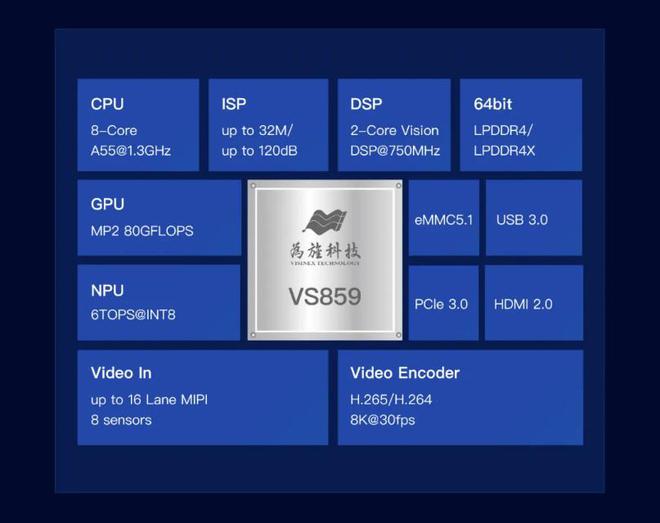 资料显示,海山系列产品图像处理能力覆盖600万像素~3200万像素,在H.265、H.264格式下,最新发布的VS859能够满足8K@30fps超高清、实时视频流的编码;最大支持8路视频输入,同步支持最大4路4K像素视频流拼接;并提供有6Tops算力,满足端侧各类AI检测、识别、决策需求。