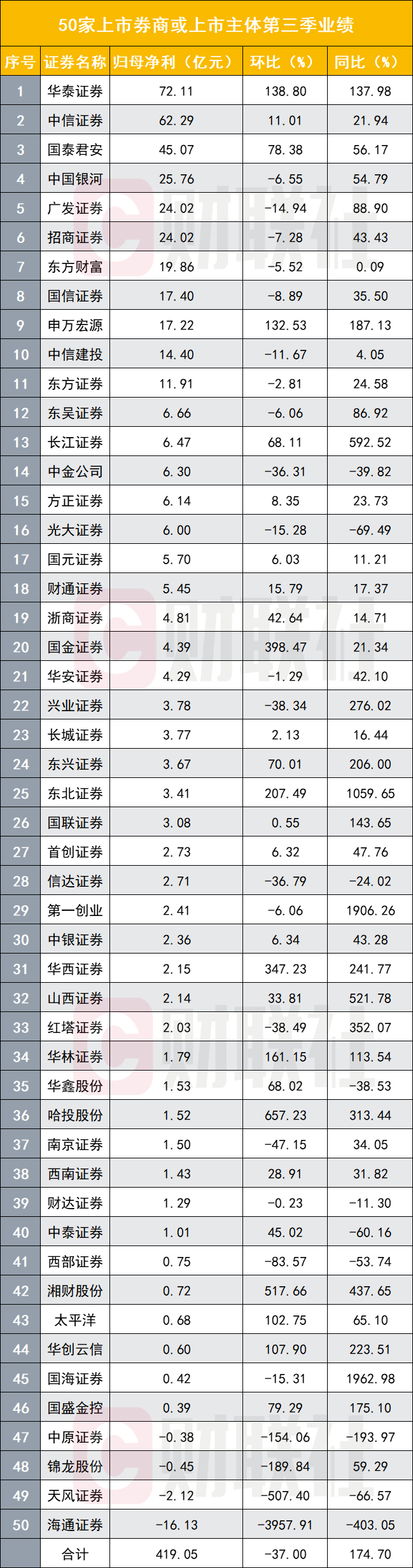 此外,值得注意的是,第三季归母净利排名中,华泰证券位居榜首,单季归母净利超过中信证券,两券商的第三季归母净利分别为72.11亿元、62.29亿元。