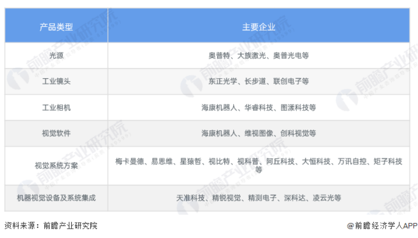 目前,机器视觉设备制造商中,天准科技、矩子科技和美亚光电的等展现出较强的市场竞争力,机器视觉系统集成商的代表企业包括凌云光、精测电子等,机器视觉系统解决方案代表企业有梅卡曼德、阿丘科技等。机器视觉产业链上游硬件领域中,联创电子、海康机器人、奥普特、北京君正分别为光学镜头、工业相机、光源设备和图像处理领域的典型厂商。
