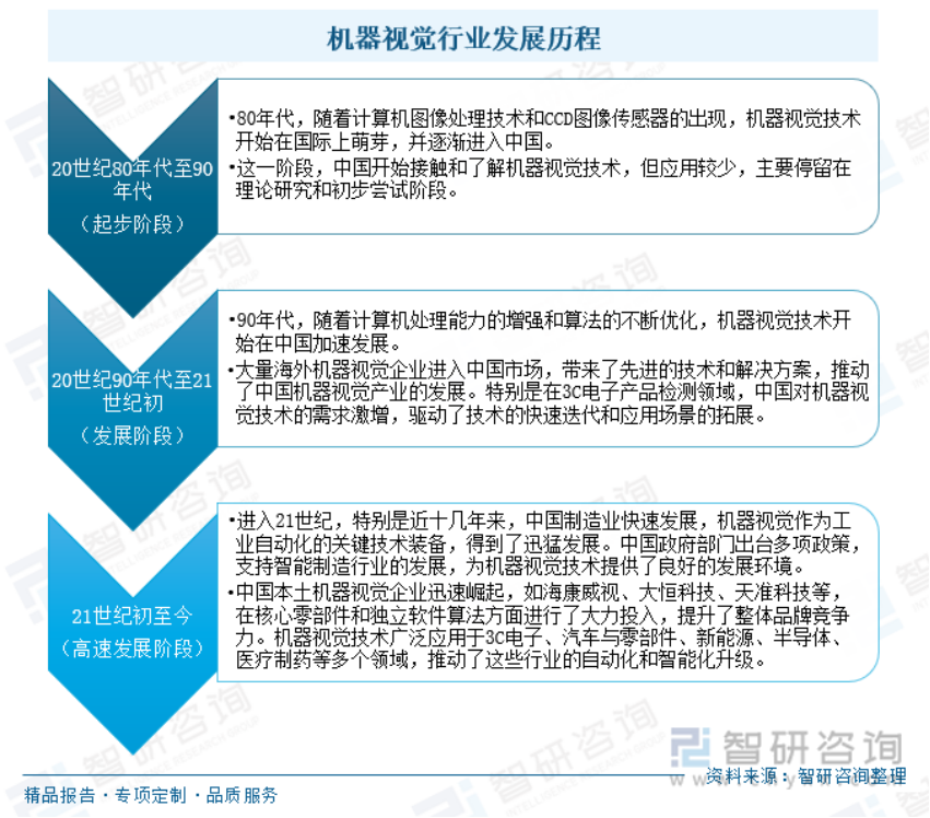 21世纪初至今的高速发展阶段,进入21世纪,特别是近十几年来,中国制造业快速发展,机器视觉作为工业自动化的关键技术装备,得到了迅猛发展。中国政府部门出台多项政策,支持智能制造行业的发展,为机器视觉技术提供了良好的发展环境。中国本土机器视觉企业迅速崛起,如海康威视、大恒科技、天准科技等,在核心零部件和独立软件算法方面进行了大力投入,提升了整体品牌竞争力。机器视觉技术广泛应用于3C电子、汽车与零部件、新能源、半导体、医疗制药等多个领域,推动了这些行业的自动化和智能化升级。
