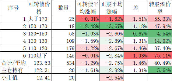 534只可转债平均下跌1.29%,对应正股平均下跌2.75%。我的主仓20只可转债平均下跌1.61%,对应正股平均下跌2.92%。账户合计实际下跌了1.46%。