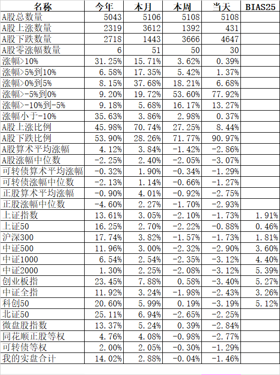 431只个股上涨,4647只个股下跌,涨幅中位数-3.07%。今年个股涨幅的中位数好不容易超过0,今天有一次跌下水面了。