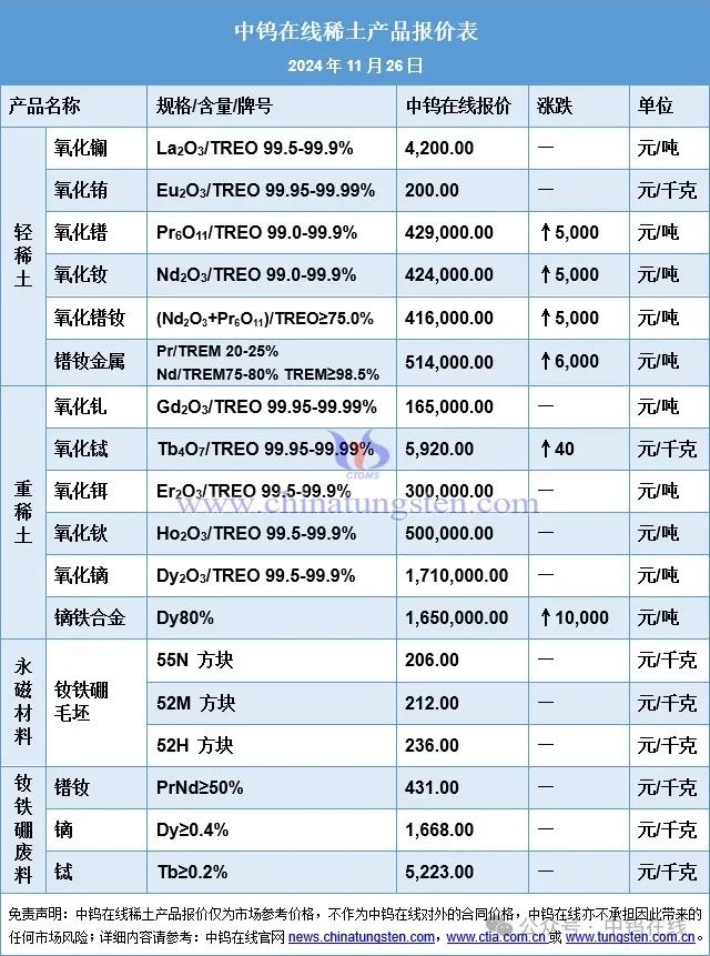 国内稀土价格整体重心小幅上移,其中氧化镨钕价格约涨5,000元/吨,镨钕金属价格约涨6,000元/吨,氧化铽价格分别约涨40元/千克,氧化镝价格约涨10,000元/吨。这主要是归因于近期主流稀土产品价格下降幅度较大,再加上生产费用不低,进而在很大程度上倒逼供应商盈利意识增强,报价上调。此外,下游用户询盘略有增多,也是使市场回暖的一个重要原因。不过,需要注意的是,当前市场总体需求仍偏弱,因而贸易商应谨慎操作。