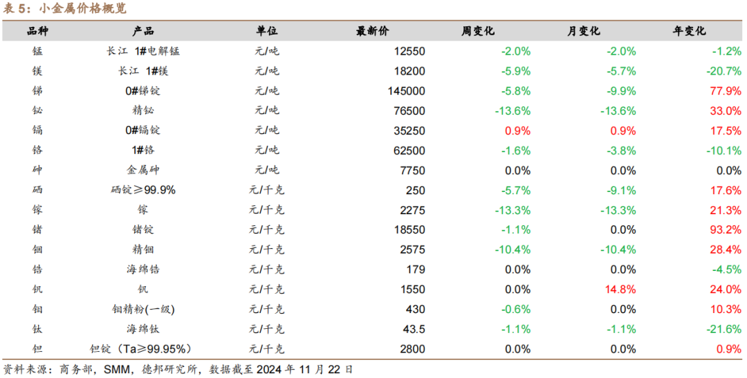 下周重要数据发布:11月27日(21:30)美国发布10月pce价格指数、三季度GDP。贵金属:俄乌冲突进一步升级,黄金价格大幅上涨。本周,国内现货金价周涨5.4%,COMEX银价涨3.5%,英国路透社报道称,两名美国官员和一名熟悉决定的消息人士周日(11月17日)表示,美国总统拜登的政府允许乌克兰使用美制武器袭击俄罗斯纵深地区,这是华盛顿在乌克兰和俄罗斯冲突中的政策发生重大逆转。乌克兰表示,袭击了俄罗斯境内约110公里处的一个武器库,乌克兰军方没有公开说明使用何种武器,但一名乌克兰政府消息人士和一名美国官员证实动用了ATACMS导弹。袭击当日刚好是俄乌战争的第1000天,在特朗普即将重返白宫之际,人们对西方支持乌克兰的前景产生怀疑。地缘冲突进一步升级,使得包括黄金在内的避险资产有所走高。工业金属:国内金属价格下跌,氧化铝价格强势。本周,SHFE铜、铝、铅、锌、锡、镍现货结算价分别变动-0.1%、-1.7%、+1.3%、+2.2%、-1.1 %、+1.6%。本周中国国产氧化铝均价为5633.53元/吨,较上周均价5479.10元/吨上涨154.43元/吨,涨幅为2.82%。本周氧化铝现货市场成交活跃度假期前期下降,现货成交量较为有限。从当前氧化铝市场行情来看,四季度内氧化铝市场仍有利好因素支撑。北方部分地区相继发布重污染天气预警,供给端扰动不断;下游电解铝行业开工仍处于相对高位,氧化铝市场需求较为强劲;海外氧化铝价格持续上行,依旧明显高于中国国产氧化铝价格,短期内中国氧化铝市场净出口局面持续。以上利好因素对氧化铝现货价格提供上行动力。但氧化铝持续上涨的情况下,下游企业操作较为谨慎,然而近期国家发布出口退税政策,导致铝价下跌,在高成本前提下,电解铝企业主动进行电解槽大修,同步降低亏损,导致业者对于氧化铝市场供需局面的变化产生担忧,市场观望情绪较浓。稀土、钨等小金属:镨钕氧化物下跌,钨精矿价格上涨。稀土方面:本周镨钕金属、镨钕氧化物价格下跌。钨方面:黑、白钨精矿价格上涨。随着制造业复苏预期不断增强,或带动用于生产切削工具、耐磨工具里的钨的需求量,中长期钨终端需求呈稳步增长态势。