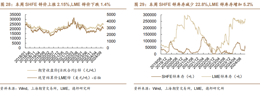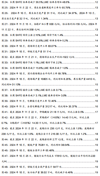1.2.4.锌:锌价分化,精炼锌企业生产仍亏损锌价分化。截至2024年11月22日,SHFE锌最新价为25170元/吨,周变动2.2%,月变化0.6%,年变化20.3%。截至2024年11月22日,LME锌最新价为2965美元/吨,周变动-1.4%,月变化-5.9%,年变化18.6%。