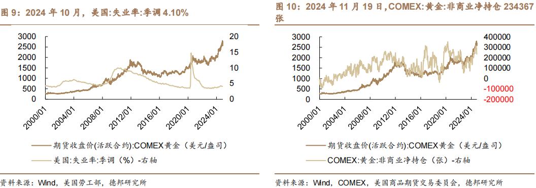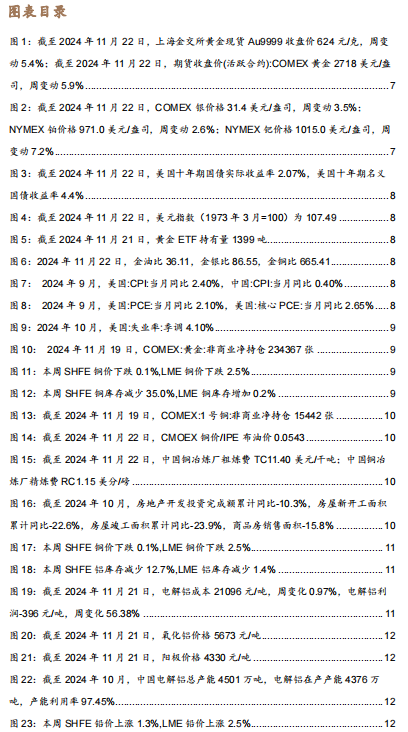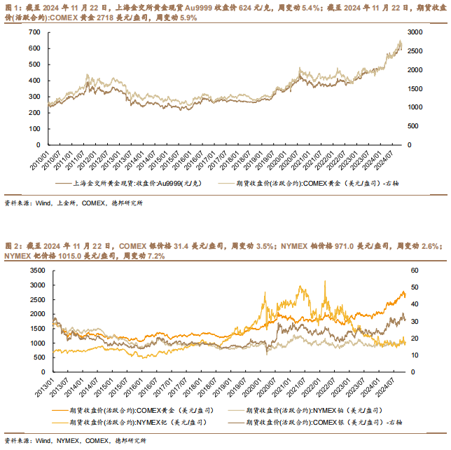 黄金价格上涨,白银价格上涨。截至2024年11月22日,上海金交所黄金现货Au9999收盘价624元/克,周变动5.4%,月变动-0.2%,年变动34.0%。截至2024年11月22日,期货收盘价(活跃合约):COMEX黄金2718美元/盎司,周变动5.9%,月变动-1.6%,年变动36.5%。