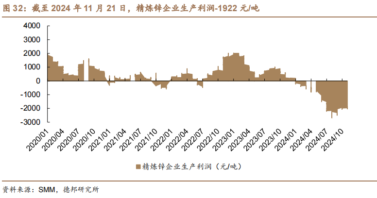 生产利润。截至2024年11月21日,精炼锌企业生产利润-1922元/吨。