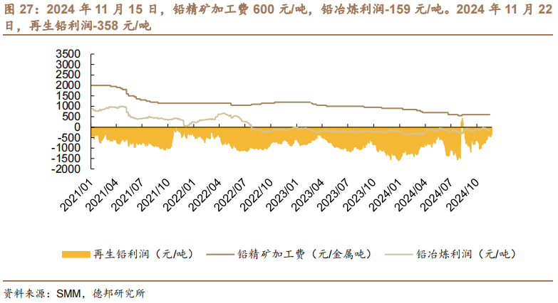 加工费和利润。2024年11月15日,铅精矿加工费600元/吨,铅冶炼利润-159元/吨。2024年11月22日,再生铅利润-358元/吨。