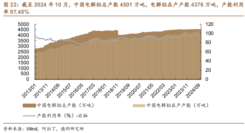 总产能和在产产能方面。截至2024年10月,中国电解铝总产能4501万吨,电解铝在产产能4376万吨,产能利用率97.45%。