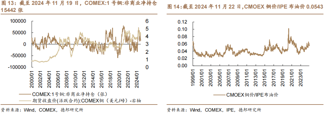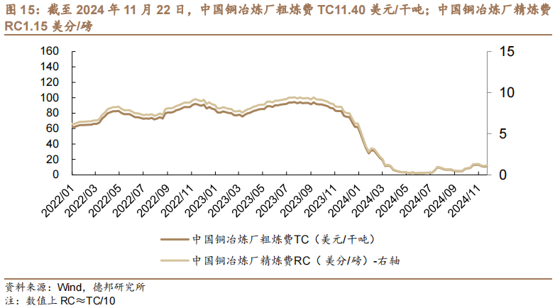 加工费方面。截至2024年11月22日,中国铜冶炼厂粗炼费TC11.40美元/干吨;中国铜冶炼厂精炼费RC1.15美分/磅。