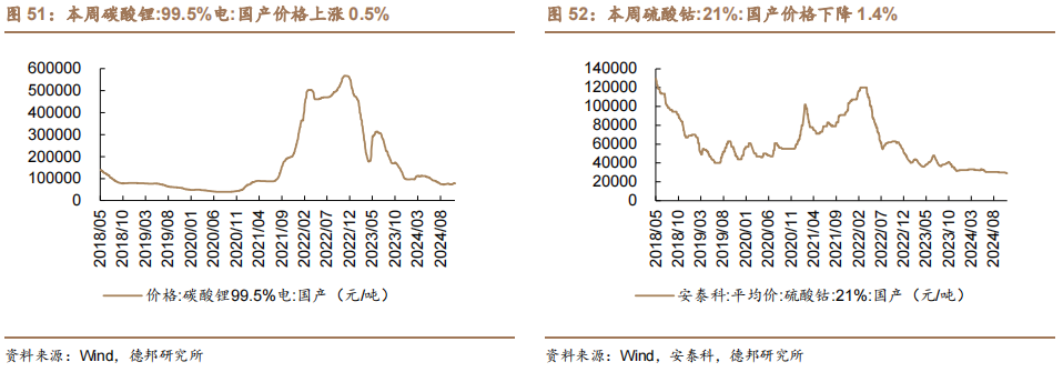 能源金属:碳酸锂价格持续反弹,关注后续能源金属需求增长情况。(1)锂:金属锂、锂精矿价格小幅下跌,碳酸锂价格上涨。(2)钴:金属钴价格上涨,氯化钴、硫酸钴、四氧化三钴价格下跌。(3)镍:镍矿(CIF)价格持平、镍金属、镍豆、镍板价格上涨,硫酸镍价格下跌。短期碳酸锂价格反弹,关注后续能源金属需求增长情况,建议关注:中矿资源、赣锋锂业、天齐锂业、格林美、永兴材料。投资建议。美联储降息周期开启,国内货币财政政策双双发力,全面看好有色金属板块投资机会,贵金属有望长牛,内需相关品种弹性或更大。1)贵金属。降息落地,实际利率下降凸显黄金配置价值,白银远期弹性更大,推荐:山东黄金、中金黄金、玉龙股份、盛达资源、兴业银锡、山金国际。2)工业金属。政策推动经济预期持续向好,与国内经济相关的工业金属价格有望回升,弹性:铝>铜>小金属>稀土。铝推荐:神火股份、天山铝业、云铝股份、中国宏桥、明泰铝业、南山铝业,关注中国铝业;铜推荐:紫金矿业、洛阳钼业、铜陵有色、金诚信、西部矿业,关注云南铜业;小金属推荐:锡业股份、驰宏锌锗,关注云南锗业;3)新材料。看好人工智能材料、人形机器人上游磁材、消费电子折叠屏零部件、钛合金材料、智能汽车零部件、卫星/超导材料等七大领域,推荐:华达新材、铂科新材、金力永磁、东睦股份、立中集团,关注银邦股份、楚江新材、东方钽业。风险提示。美国降息不及预期;经济复苏进度不及预期;海外需求恢复不及预期。