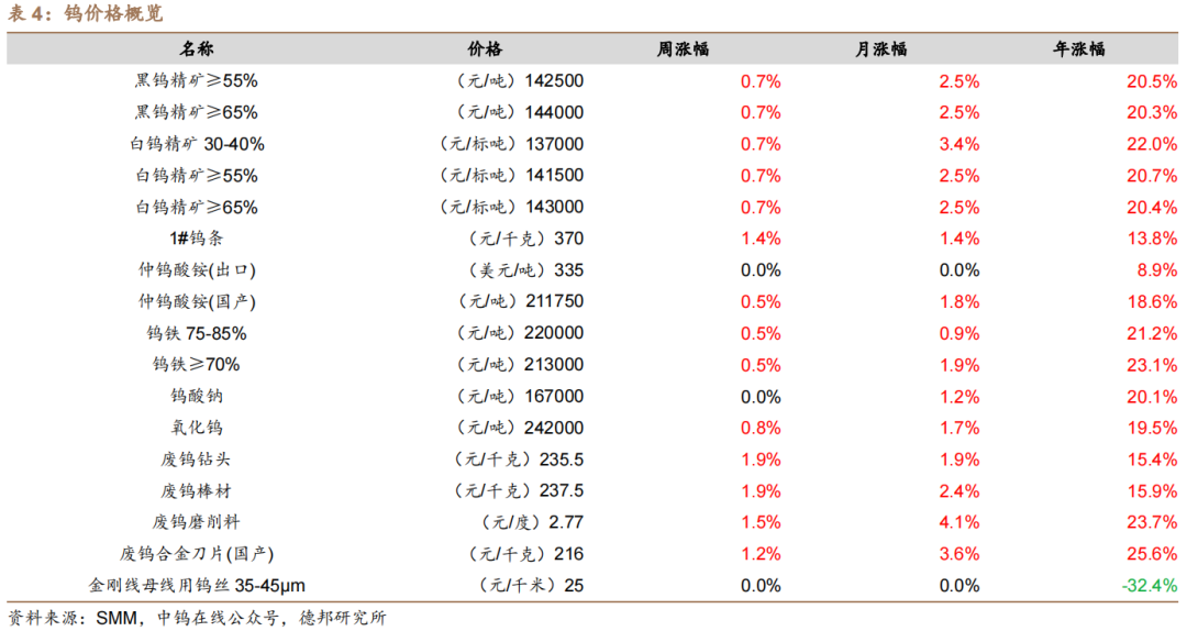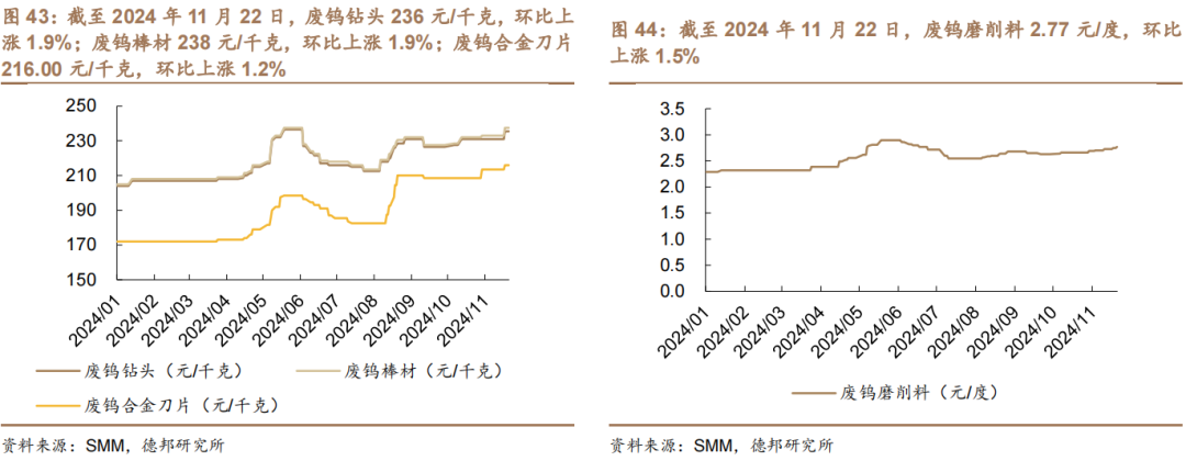 钨精矿价格上涨。截至2024年11月22日,国产仲钨酸铵211750元/吨,周变动0.5%,月变动1.8%,年变动18.6%。