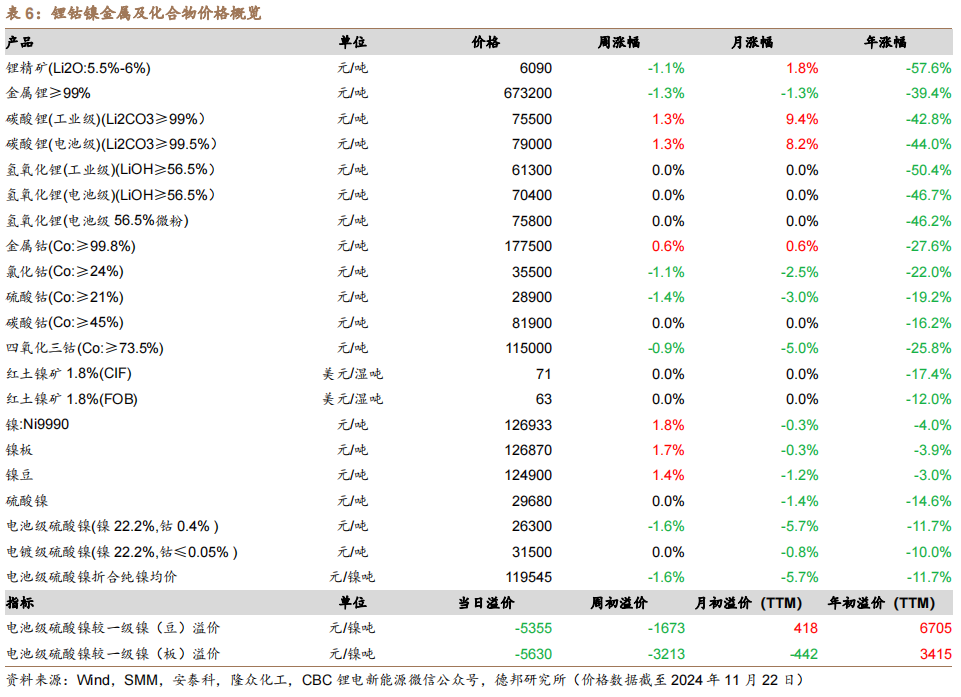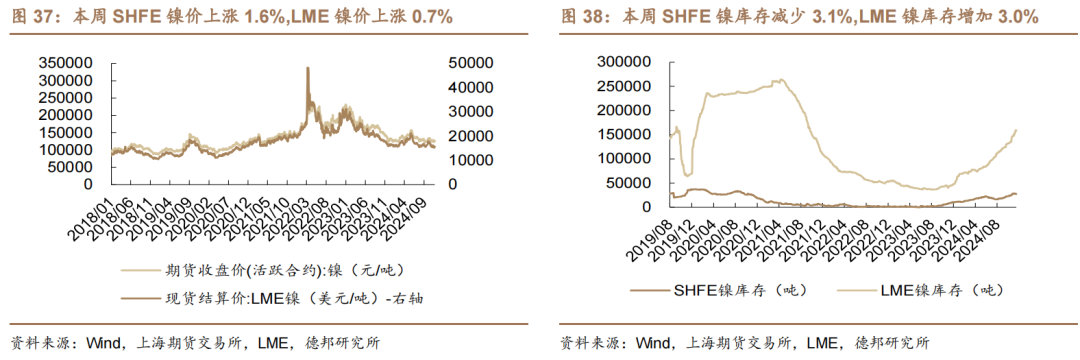 镍价上涨。截至2024年11月22日,SHFE镍最新价为125090元/吨,周变动1.6%,月变化-1.7%,年变化-3.3%。截至2024年11月22日,LME镍最新价为15610美元/吨,周变动0.7%,月变化-4.3%,年变化-5.0%。