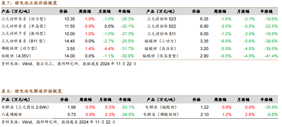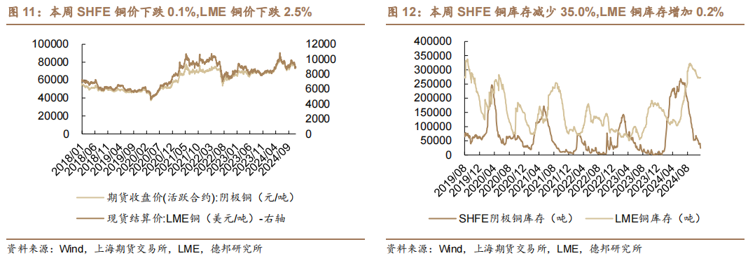 铜价下跌。截至2024年11月22日,SHFE铜最新价为73760元/吨,周变动-0.1%,月变化-4.5%,年变化8.6%。截至2024年11月22日,LME铜最新价为8829美元/吨,周变动-2.5%,月变化-7.0%,年变化6.4%。