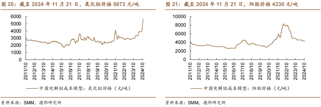 成本利润方面。截至2024年11月21日,电解铝成本21096元/吨,周变化0.97%,电解铝利润-396元/吨,周变化56.38%。其中,氧化铝价格5673元/吨,阳极价格4330元/吨。