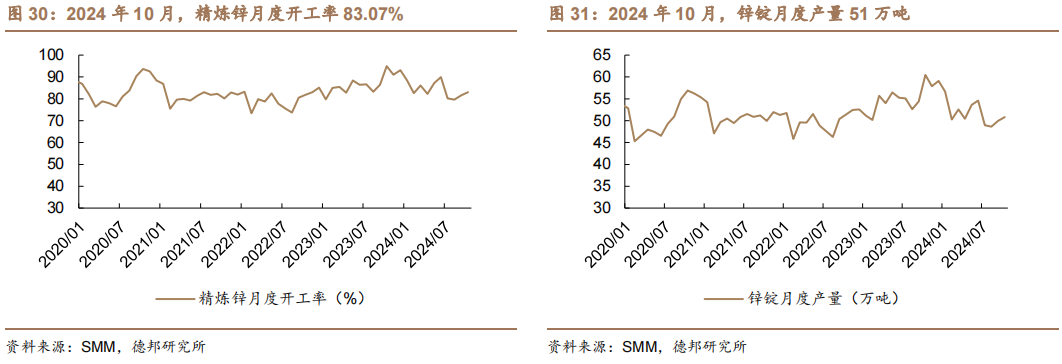 开工率和产量。2024年10月,精炼锌月度开工率83.07%。2024年10月,锌锭月度产量51万吨。