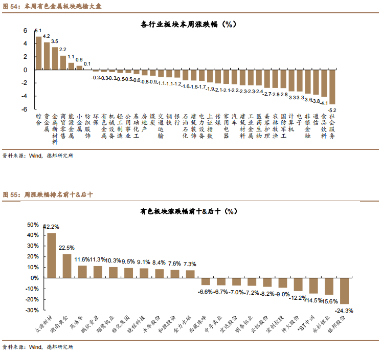 涨跌幅后十名:银邦股份(-24.31%)、永杉锂业(-15.61%)、*ST中润(-14.47%)、神火股份(-12.21%)、宏创控股(-9.04%)、云铝股份(-8.20%)、明泰铝业(-7.24%)、宏达股份(-6.95%)、中孚实业(-6.69%)、西藏珠峰(-6.60%)。