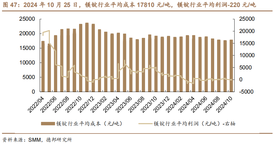 成本及利润方面。2024年10月25日,镁锭行业平均成本17810元/吨,镁锭行业平均利润-220元/吨。