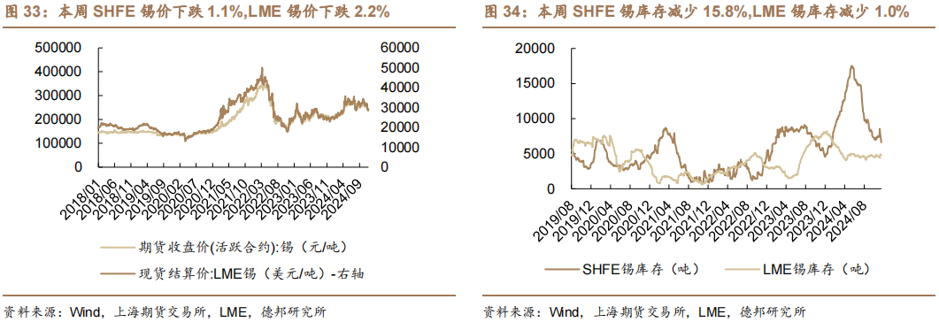 锡价下跌。截至2024年11月22日,SHFE锡最新价为240800元/吨,周变动-1.1%,月变化-4.6%,年变化16.8%。截至2024年11月22日,LME锡最新价为28535美元/吨,周变动-2.2%,月变化-7.6%,年变化16.1%。