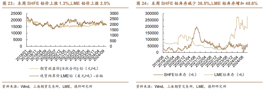 开工率和产量。2024年11月22日,原生铅最新周度开工率为65.79%。2024年10月,再生铅月度产量31万吨,同比减少34.97%,2024年10月,原生铅月度产量32万吨,同比减少1.34%。