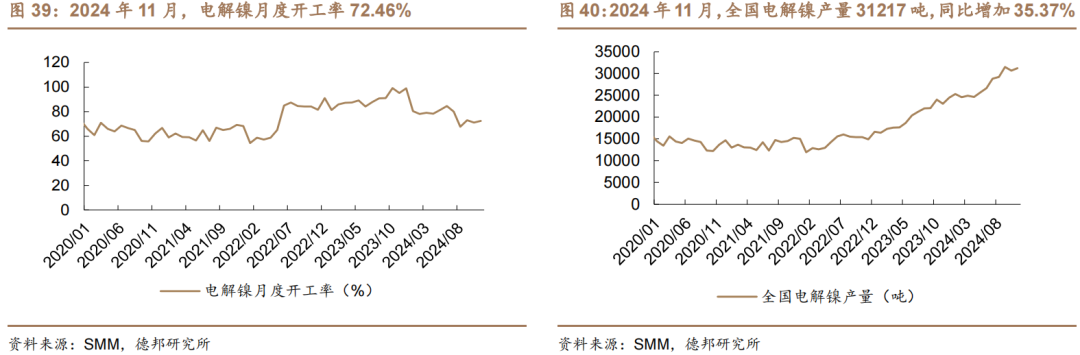 开工率和产量。2024年11月,全国电解镍产量31217吨,同比增加35.37%;2024年11月,电解镍月度开工率72.46%。