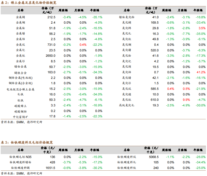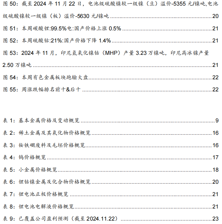 1.1. 贵金属:黄金价格上涨,黄金ETF持有量提升.. 71.2. 工业金属:国内外价格分化.. 91.2.1. 铜:铜价下跌,铜冶炼加工费上涨,SHFE去库.. 91.2.2. 铝:铝价下跌,电解铝利润持续下跌.. 111.2.3. 铅:铅价上涨,原生铅开工率增长.. 121.2.4. 锌:锌价分化,精炼锌企业生产仍亏损.. 131.2.5. 锡:锡价下跌,精炼锡开工率上升.. 141.2.6. 镍:镍价上涨,电解镍月度开工率上升.. 151.3. 稀土&钨:镨钕氧化物价格下跌,钨精矿价格上涨.. 161.4. 小金属:镉价格上涨.. 181.5. 能源金属:碳酸锂上涨.. 192. 行情数据.. 223. 本周重要事件回顾.. 233.1. 行业新闻.. 234. 盈利预测.. 235. 风险提示 24