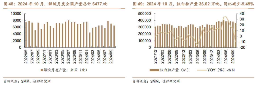 锑、钛白粉产量方面。2024年10月,锑锭月度全国产量总计6477吨。2024年10月,钛白粉产量36.02万吨,同比减少-9.49%。