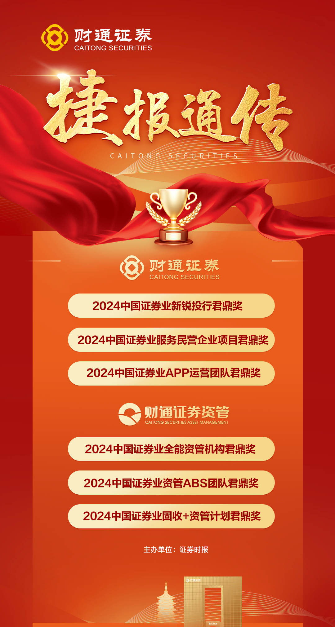 近日,由《证券时报》主办的“2024中国证券业君鼎奖”评选结果揭晓。财通证券摘得“2024中国证券业新锐投行君鼎奖” “2024中国证券业服务民营企业项目君鼎奖” “2024中国证券业APP运营团队君鼎奖”;子公司财通证券资管斩获“2024中国证券业全能资管机构君鼎奖”“2024中国证券业资管ABS团队君鼎奖”“2024中国证券业固收+资管计划君鼎奖”。