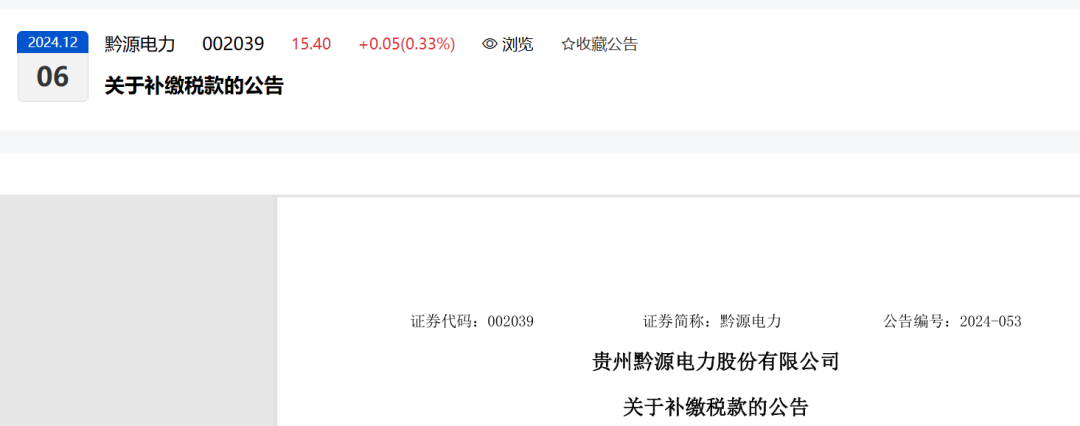 结合国家税务总局贵阳市南明区税务局第二税务分局税务事项通知书(南税二分通﹝2024﹞1329号、南税二分通﹝2024﹞2518号)要求,经自查,贵州黔源电力股份有限公司(以下简称“公司”)需补缴2015年度—2017年度享受的西部大开发企业所得税优惠税款15,508,396.37元,滞纳金22,078,541.48元,合计37,586,937.85元。