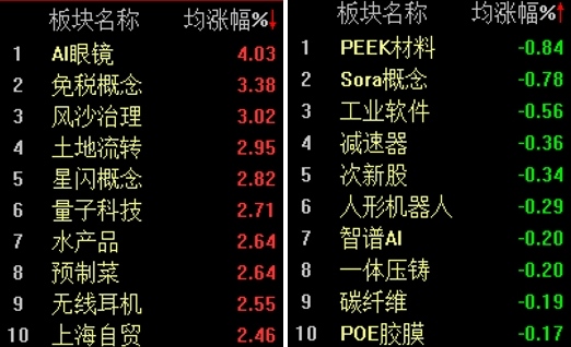 板块方面,上海国资改革概念股掀涨停潮,交运股份、益民集团、上海物贸、第一医药、开开实业、上海九百等多股涨停。消费电子概念活跃,AI穿戴方向领涨,天键股份、星星科技、胜利精密、卓翼科技、漫步者、瀛通通讯、卓翼科技等涨停。