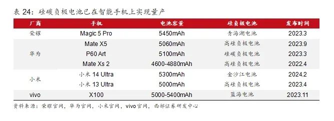 硅负极高比容量提升能量密度,已率先应用于消费电子。现有石墨材料理论克容量可达365mAh/g,接近上限372mAh/g,硅材料理论克容量可达4000mAh/g以上,能够大幅提升能量密度。目前,硅碳负极已应用于手机领域,2021年小米11 Pro成为首款搭载5000mAh硅氧负极电池的智能手机,而后华为、荣耀、vivo相继发布硅基负极电池,硅负极电池技术有望在消费领域加速普及。