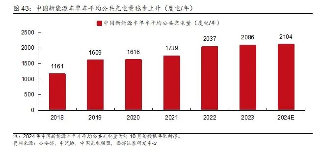 中国新能源车单车平均公共充电量稳步上升,预计2024年可达到2100度电以上。根据公安部、中汽协及中国充电联盟数据,我们利用全国充电量以及全国新能源车保有量计算可得中国新能源车单车平均公共充电量呈现稳步上升趋势。2023年中国新能源车单车平均公共充电量达2086度电/年,同比+2.4%,我们根据2024年前10月数据年化可得2024年中国新能源车单车平均公共充电量达2104度电,达到历史新高,同比+0.9%。我们认为中国新能源车普及率越来越高,单车带电量提升、智能化水平提升以及长途出行将不断提升中国新能源车单车平均公共充电量,公共充电服务市场具备较大的发展空间。