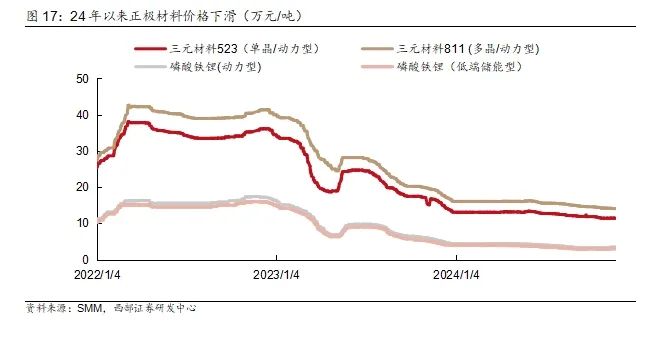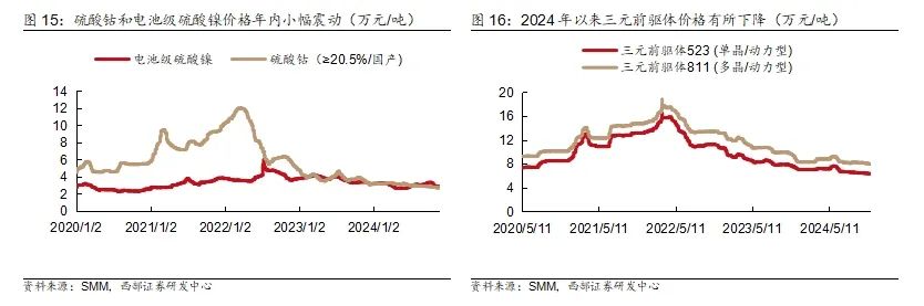 镍钴:价格保持区间震荡,前驱体价格有所下降。24Q4印尼镍资源产能集中释放,下游不锈钢和三元电池需求疲软,短期库存上升,价格或保持区间震荡。根据SMM数据,截至2024年11月22日,电池级硫酸镍/硫酸钴价格为2.63万元/吨和2.72万元/吨,同比-11.74%/-22.43%,相比2024年1月初价格分别下降0.38%/14.49%。三元前驱体523(单晶/动力型)和811(多晶/动力型)价格分别为6.30/7.91万元/吨,同比-15.41%/-15.84%,相比2024年1月初价格分别下降10.48%/4.62%。