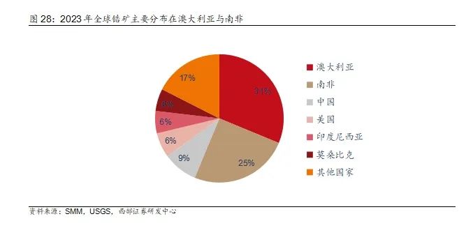 我国是全球最大锆矿资源进口国,供给侧格局长期偏紧。作为全球的锆消费大国,中国消费了全球近70%的锆供应量,据USGS,2023年全球锆矿储量约7400万吨,主要分布在澳大利亚与南非,占比为74.32%和7.57%,我国储量为7.2万吨,占比仅0.10%,消费量与储量的巨大缺口导致国内锆英砂的供应严重不足,进口依赖度高达90%。