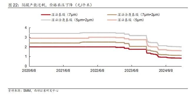 隔膜:价格保持稳定,头部产能利用率较高。根据SMM数据,截至24年11月22日,湿法基膜(7µm)/湿法基膜(5µm)/湿法涂覆基膜(7µm+2µm)/湿法涂覆基膜(5µm+2µm)价格分别为0.83/1.60/1.11/2.00元/平米,价格自9月起保持平稳。今年以来隔膜价格处于下行态势,主要是隔膜产能过剩、竞争加剧,小厂通过降价抢占市场份额;11月25日,中国塑料加工工业协会电池薄膜专委会发布关于促进电池隔膜行业健康发展的倡议书,倡导隔膜行业健康发展。我们认为隔膜行业短期仍处供给过剩状态,但价格已保持平稳,头部产能利用率较高,随着尾部厂商出清,行业供需格局有望逐步改善。