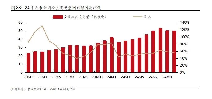 24年以来全国公共充电量同比维持高增。根据中国充电联盟数据,24年以来全国月度公共充电量上升趋势明显,24M1-M10全国公共充电量达446亿度电,同比+56%,其中24M10全国公共充电量达50亿度电,同比+56%。