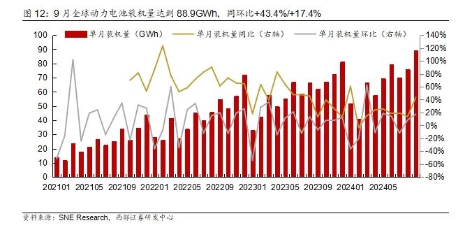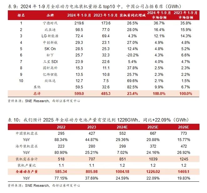 24年1-9月中国电池厂占据全球6成份额,宁德时代龙头地位稳固。根据SNE Research数据,2024年1-9月全球动力锂电池装机量达到599.0GWh,同比+23.4%。从TOP10公司来看,中国公司占据6席,市占率合计达64.9%;其中,宁德时代龙头地位稳固,1-9月全球装机量219.6GWh,同比+26.5%,市场份额36.7%,同比+0.9pct。明年国内新能源汽车保持稳定增长,海外电动车销量有望回升,中游电池装机量增速有望进一步提升,我们预计2025年全球动力电池产量有望达到1226GWh,同比+22.09%。
