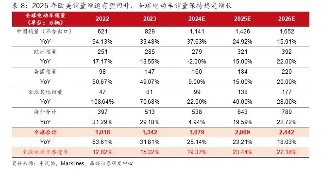 2.2 海外新能源车:预计2025年海外新能源汽车销量增速+19.59%,2026年增速提高