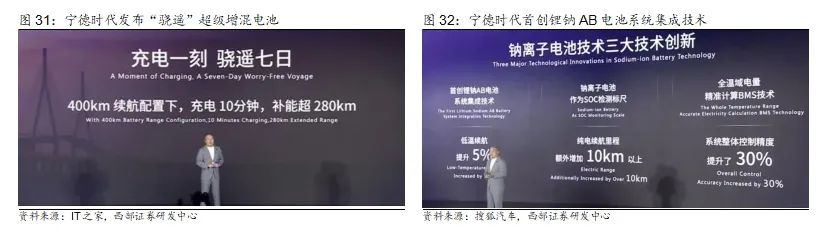 宁德发布骁遥增混电池,加速动力钠电商业化应用。10月24日,宁德时代发布“骁遥”超级增混电池。骁遥超级增混电池续航达到400km以上,兼具4C超充功能,能够实现“充电十分钟,续航280公里”。低温场景中,宁德时代将钠离子电池技术落地超级增混电池中,首创锂钠AB电池系统集成技术,零下四十度以下电池可放电,目前已在多个品牌车企上落地。宁德时代增混电池在提升续航、快充性能的同时,引入钠离子后兼具低温性能表现,有望在混动车型实现大规模应用。11月17日,宁德时代吴凯表示:第二代钠离子电池已经研发完成,能够在零下 40 度的严寒环境中正常放电,可在极严寒地区大规模应用。第二代钠电池有望于 2025 年推向市场。