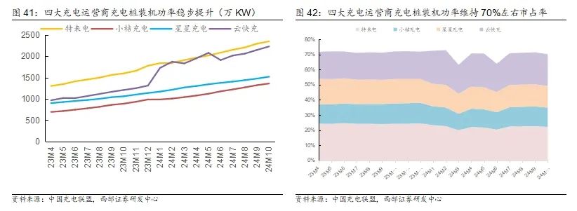 四大充电运营商充电量快速提升,CR4维持70%以上较高集中度。根据中国充电联盟数据,四大充电运营商充电量也快速提升,24M1-M10特来电、小桔充电、星星充电、云快充充电量分别达105/88/80/52亿度电,市场份额分别为24%/20%/18%/12%。24M10特来电、小桔充电、星星充电、云快充充电量分别为11.6/10.3/8.6/6.3亿度电,同比+44%/+60%/+39%/+77%,均保持高增速。24M10特来电/小桔充电/星星充电/云快充市场份额分别为23.1%/20.6%/17.2%/12.7%,CR4达73.6%。